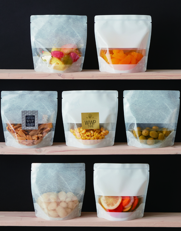 特徴:独自の風合いや質感のある藁入り白クラフト素材を使用し、表面の中央に窓抜き加工を施したチャック付スタンド袋です。藁入りクラフト紙を使用する事で高級感を演出し、より商品を引き立たせる効果があります。商品を充填すれば自立しディスプレイに最適です。酸素バリア性に優れ、脱酸素剤を併用することで、カビの発生、酸化による品質の劣化を抑制し、食品の保存性がさらに向上します。また、防湿性にも優れています。