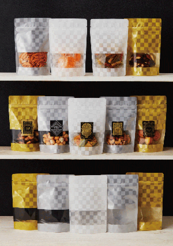 特徴:伝統とモダンが融合した市松模様デザインのチャック付三方袋(フック穴付)です。市松模様を大胆にあしらい、視認性と高級感を両立。中央下に多角形の窓を設け、中身がしっかり見える安心設計!