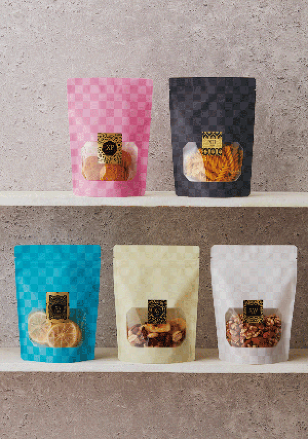 特徴:和モダンな市松模様が印象的なチャック付スタンドパックです。和の美しさと実用性を兼ね備えシリーズ展開に最適なパッケージです。