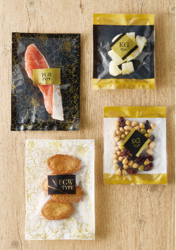 特徴:表面は透明、裏面は光沢黒で、商品を入れると内側の黒が中身を際立たせた高級感のある黒柄のバリア性・チャック付スタンドです。酸素バリア性に優れ、脱酸素剤を併用することで、カビの発生、酸化による品質の劣化を抑制し、食品の保存性がさらに向上します。また、防湿性にも優れています。