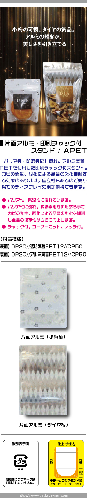 ![]() ■APETタイプ商品特性 バリア性・防湿性があり、表面が透明で裏面に片面アルミ(小梅柄・ダイア柄)を使用する事で、より商品を引き立たせる効果があります。商品を充填すれば自立し店頭ディスプレイに最適です。 脱酸素剤を併用することで、カビの発生、酸化による品質の劣化を抑制し、食品の保存性がさらに向上します。