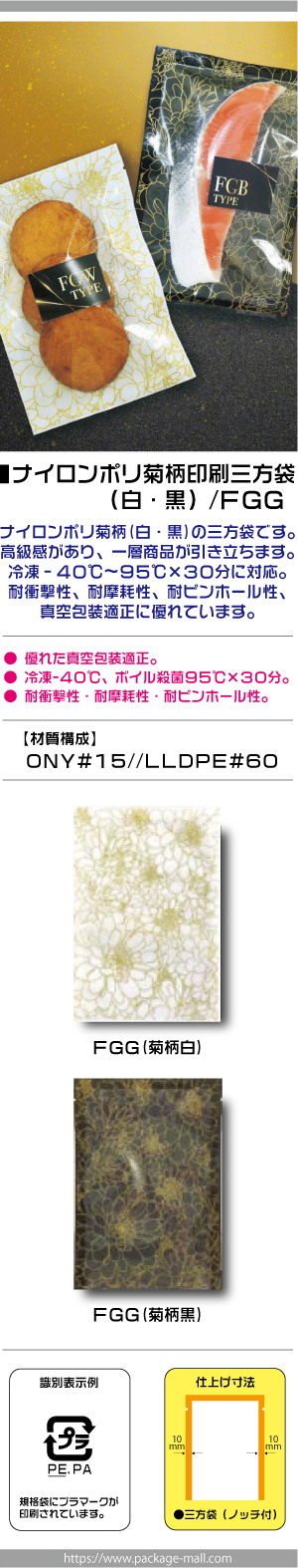 ![]() ■FGGタイプ商品特性 真空包装・ボイル殺菌・冷凍用菊柄白・黒印刷三方袋です。冷凍-40℃~ボイル殺菌95℃×30分対応。袋強度の要求される液体及び粘体物の包装。 耐衝撃性、耐摩耗性、耐ピンホール性に優れており真空包装の適正があります。耐ピンホール性の要求される真空包装や耐熱、耐寒等の包装に幅広くご使用頂けます。