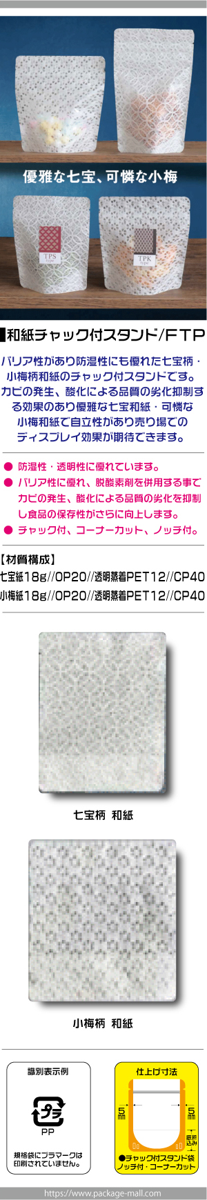 ![]() ■FTPタイプ商品特性 バリア性・防湿性のある上品な和紙(七宝柄・小梅柄)チャック付スタンドパックです。 脱酸素剤を併用することで、カビの発生、酸化による品質の劣化を抑制し、食品の保存性がさらに向上します。