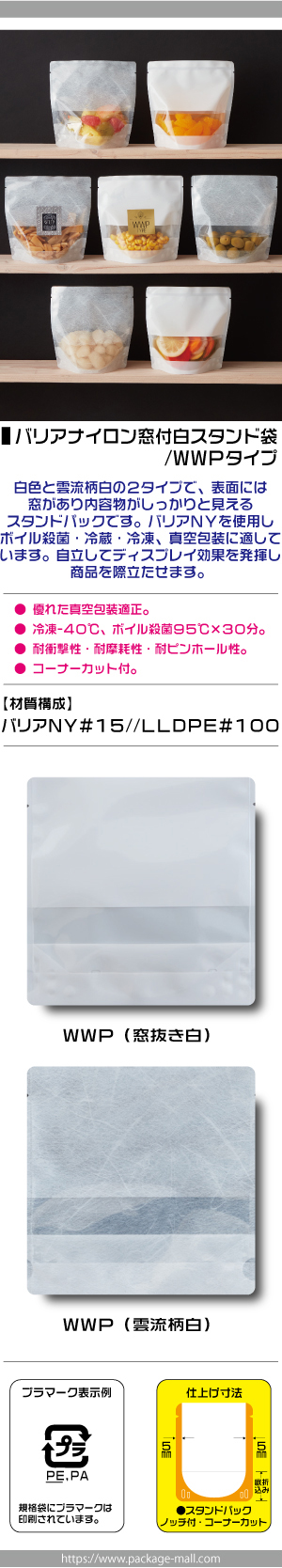 ![]() ■WWPタイプ商品特性 白色と雲流柄白の2タイプで、共に表面には窓があり内容物がしっかりと見えるスタンドパックです。幅広い用途にご使用頂けます。 酸素バリア性に優れ、脱酸素剤やガス充填を併用することで、食品の保存性がさらに向上します。耐衝撃性、耐摩耗性、耐ピンホール性に優れており真空包装の適正があります。冷凍-40℃~ボイル殺菌95℃×30分対応。コーナーカット加工。