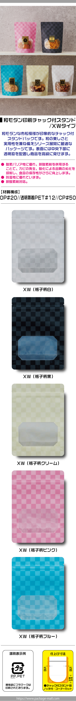 ![]() ■XWタイプ商品特性 和モダンな市松模様が印象的なチャック付スタンドパックです。和の美しさと実用性を兼ね備えシリーズ展開に最適なパッケージです。 酸素バリア性に優れ、脱酸素剤を併用することで、カビの発生、酸化による品質の劣化を抑制し、食品の保存性がさらに向上します。また、防湿性にも優れています。