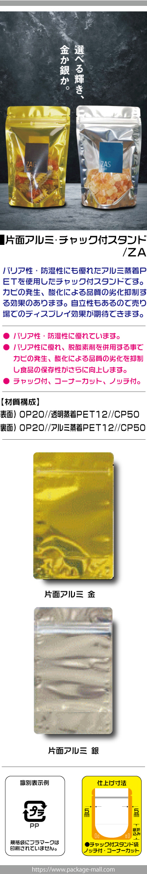 ![]() ■ZAタイプ商品特性 バリア性・防湿性があり、表面が透明で裏面に片面アルミ(金・銀)を使用する事で、より商品を引き立たせる効果があります。商品を充填すれば自立し店頭ディスプレイに最適です。 脱酸素剤を併用することで、カビの発生、酸化による品質の劣化を抑制し、食品の保存性がさらに向上します。